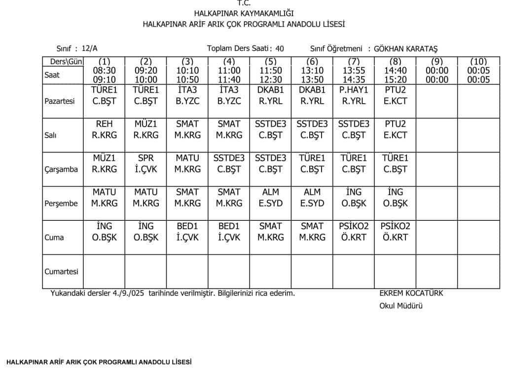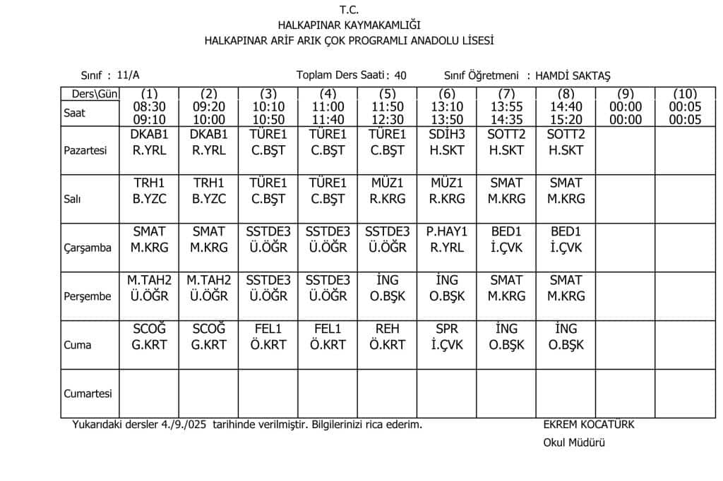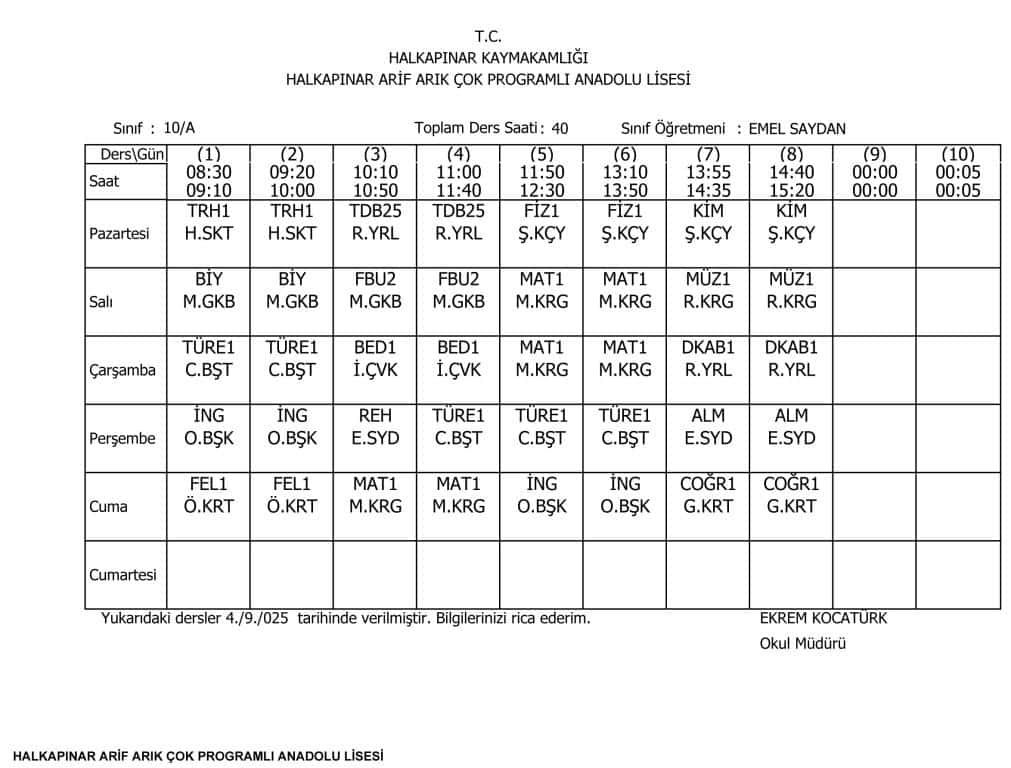 YENİ EĞİTİM YILI DERS PROGRAMI ŞÖYLE;